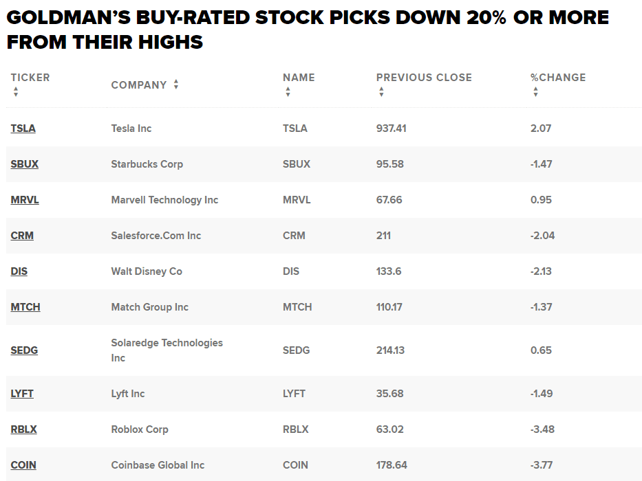 V poznámce upozornil na několik společností, které mají od analytiků Goldman Sachs nákupní rating a které od svých maxim z roku 2021 klesly o 20 až 50 %. Každá z nich je členem firemního seznamu „Innovators, Disruptors, Enablers, Adaptors“.