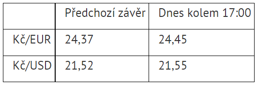 Koruna si k dnešním 17:00 pohoršila proti předchozímu závěru k euru o osm haléřů na 24,45 Kč/EUR a k dolaru o tři haléře na 21,55 Kč/USD. Vyplývá to z údajů na serveru Patria Online. Koruna posilovala od 3. ledna, a dostala se tak v předchozích dnech až na nejsilnější úroveň k euru od září 2012.