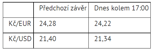 Proti středečnímu závěru zpevnila o šest haléřů na 24,22 Kč/EUR. Obdobně o šest haléřů posílila také k dolaru na 21,34 Kč/USD. Vyplývá to z údajů na serveru Patria Online.