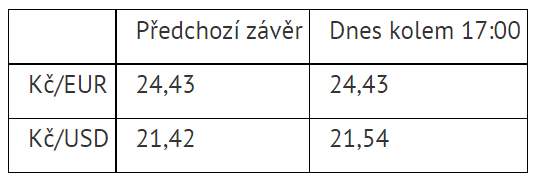 „Kurz koruny se dnes pohyboval převážně v úzkém pásmu 24,40 až 24,45 Kč/EUR,“ sdělila analytička Komerční banky Jana Steckerová. „Žádná zajímavější data zveřejněna nebyla a na rozhovor guvernéra centrální banky Jiřího Rusnoka pro Deník N koruna nereagovala,“ doplnila.