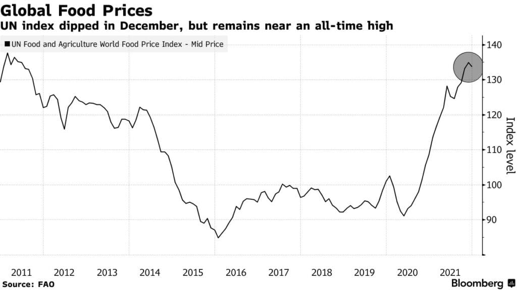 Index Organizace spojených národů, který sleduje vše od obilovin až po maso, v prosinci klesl o 0,9 %, což by mohlo pomoci zmírnit nárůst cen potravinářských výrobků. Přesto zůstává tento ukazatel blízko historického maxima z roku 2011 a průměrné ceny v roce 2021 vyskočily přibližně o 28 %, což je nejvíce za posledních 14 let.
