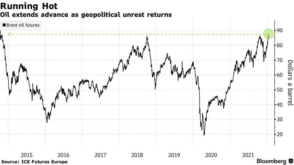 K býčí náladě přispívá další posilování fyzického trhu s ropou v Asii a snižující se celosvětové zásoby ropy. Společnost Goldman Sachs Group Inc. zvýšila své prognózy pro ropu Brent do roku 2022 a 2023 a ve třetím čtvrtletí předpovídá ropu za 100 dolarů.