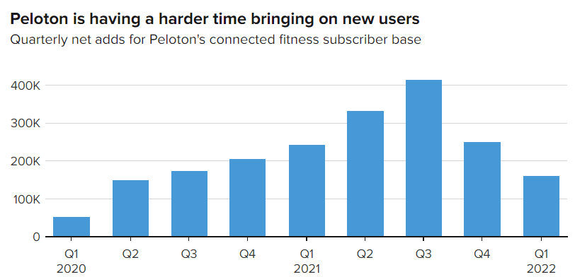 V posledních měsících společnost Peloton zaznamenala zpomalení tempa růstu svých tržeb a za čtvrtletí jí nepřibývá tolik nových uživatelů jako o rok dříve. Něco z toho se dalo očekávat, protože pandemie podnítila mimořádnou spotřebitelskou poptávku po fitness produktech Peloton, když byly dočasně uzavřeny posilovny a lidé chtěli cvičit doma. Nyní však mají spotřebitelé na výběr z mnoha možností domácího fitness: Tonal, Hydrow, Mirror, Tempo a Clmbr, abychom jmenovali alespoň některé. Mohou se také rozhodnout pro návrat do posilovny nebo butikové fitness třídy.