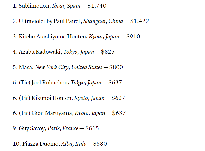 Mnohé z nich účtují 300-400 dolarů za jedno jídlo, některé však nabízejí ceny ještě vyšší.