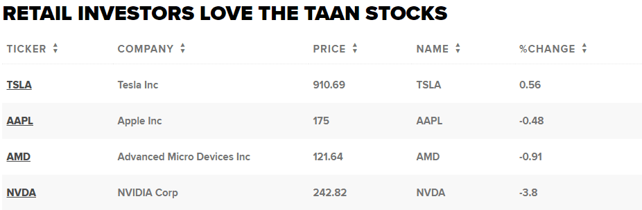 Jedná se o akcie takzvaných TAAN: Tesla, Apple, Advanced Micro Devices a Nvidia. Tyto akcie zaujímaly 61 % všech nákupů na Nasdaq-100 v minulém týdnu, poznamenává společnost Vanda.