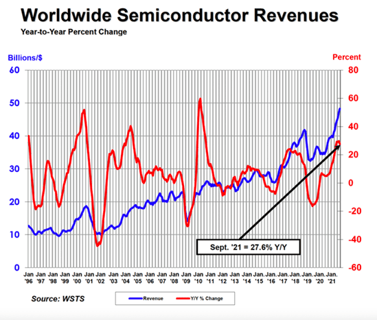 Podle statistik Asociace polovodičového průmyslu se celosvětový prodej polovodičů v letech 2018 až 2019 sníží, ale v roce 2020 již vzroste o 6,5 %. A pak se rapidně zrychlil: ve třetím čtvrtletí roku 2021 byl prodej o 27 % vyšší než ve stejném období loňského roku. Ve třetím čtvrtletí roku 2021 dodali výrobci na trh více polovodičů než v kterémkoli předchozím čtvrtletí v historii.