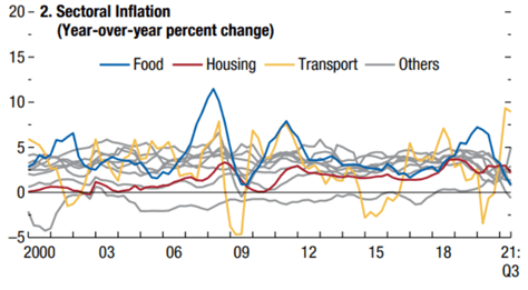 Podle MMF vedla pandemická krize k výrazným cenovým změnám v řadě odvětví, včetně dopravy, potravin, oděvů a komunikací. Tři nejdůležitější složky spotřebního koše tvoří v průměru doprava, potraviny a bydlení.