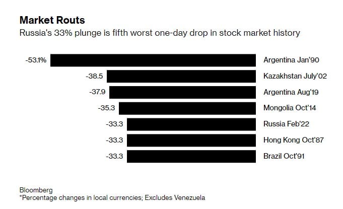 Referenční ruský index MOEX uzavřel v Moskvě o 33 % níže, čímž došlo k vymazání 189 miliard USD v majetku akcionářů, protože západní představitelé slíbili, že po vstupu vojenských sil na Ukrajinu zpřísní sankce vůči Rusku. To je pátý nejbrutálnější jednodenní výprodej mezi 90 globálními akciovými indexy analyzovanými agenturou Bloomberg.