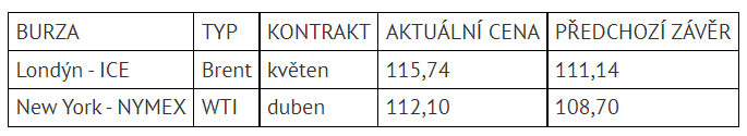 Na trhu panuje nejistota ohledně toho, zda Organizace zemí vyvážejících ropu (OPEC) a její spojenci přikročí k výraznějšímu zvyšování těžby, aby kompenzovali výpadky dodávek z Ruska. Cena severomořské ropy Brent kolem 10:30 SEČ vykazovala nárůst o 4,1 procenta zhruba na 115,70 dolaru za barel. Americká lehká ropa West Texas Intermediate (WTI) si ve stejnou dobu připisovala 3,1 procenta na 112,10 dolaru za barel.