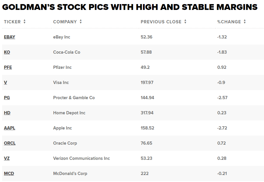 Akcie zahrnují všechny sektory, i když Goldman uvedl, že vyloučil finanční a realitní sektor. Většina z nich má tendenci k vyššímu růstu a generuje hotovost.