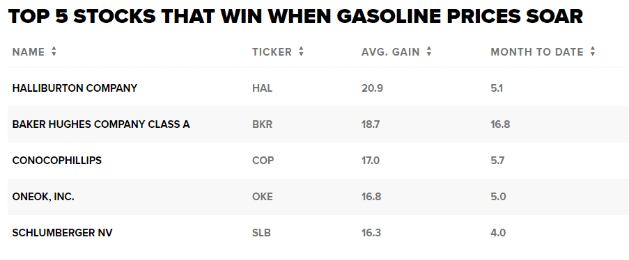 K nalezení stálých vítězů během prudkých nárůstů cen benzínu použila společnost CNBC Pro údaje společnosti FactSet k vyhledání akcií, které v posledních deseti letech zaznamenaly největší průměrný nárůst, když futures na benzin v daném měsíci vyskočily o 20 % nebo více. K nejčasnějšímu zaznamenanému skoku došlo v březnu 2015 a k nejnovějšímu v únoru 2021, nepočítaje v to aktuální měsíc.