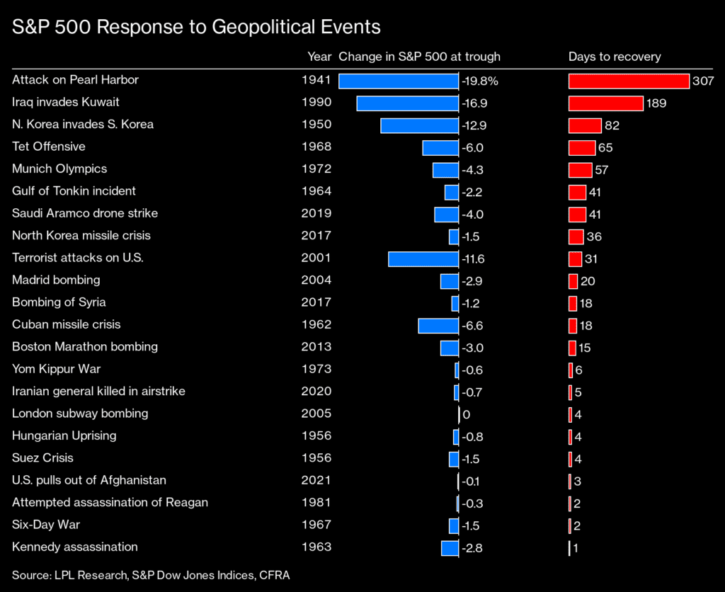Ryan Detrick, hlavní tržní stratég společnosti LPL Financial, se zabýval 22 významnými nefinančními otřesy, počínaje útokem na Pearl Harbor. I když žádné dvě události nebyly stejné, akciový trh se z nich dokázal rychle oklepat. Tyto události vedly v průměru k jednodenní ztrátě přibližně 1,1 %. Celkové propady v důsledku geopolitických událostí, než se dostaly na dno a vyšplhaly se zpět, činily v průměru 4,8 %. Dokončení poklesu obvykle trvalo 19,7 dne a odraz zpět 43,2 dne. Dokonce i vstup USA do druhé světové války po Pearl Harboru zabral trhu jen rok a půl, než se z něj plně zotavil. Na nejhorší válku v dějinách lidstva potřebovaly americké akcie jen 143 dní, aby se dostaly na dno, a po dalších 307 dnech byly výše, než odkud padaly.