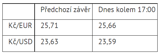 Vůči euru si od pondělního podvečera polepšila o pět haléřů na 25,66 Kč/EUR a k dolaru o čtyři haléře 23,59 Kč/USD. Vyplývá to z údajů serveru Patria Online kolem dnešních 17:00.