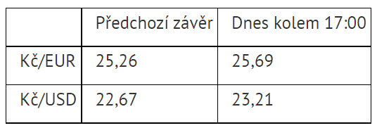 Koruna vůči oběma hlavním světovým měnám prudce oslabuje už zhruba od pondělí 21. února. Tehdy ruský prezident Vladimir Putin podepsal dokumenty uznávající nezávislost území na východě Ukrajiny ovládaných proruskými separatisty, samozvané Doněcké lidové republiky a Luhanské lidové republiky. Ve čtvrtek 24. února pak Rusko zahájilo útok a invazi na Ukrajinu. Česká měna od začátku minulého týdne oslabila k euru o více než 1,2 koruny a k dolaru přibližně o 1,7 koruny.