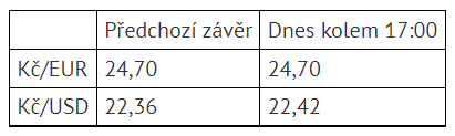 Koruna k 17:00 zůstala k euru ve srovnání s předchozím závěrem beze změny na 24,70 Kč/EUR. K dolaru si po pondělním posílení zase pohoršila, a to o šest haléřů na 22,42 Kč/USD. Vyplývá to z údajů na serveru Patria Online.