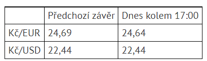 Kolem 17:00 se obchodovala k jednotné evropské měně za 24,64 Kč/EUR a proti čtvrtku tak získala pět haléřů. K americké měně koruna stagnovala na čtvrtečních 22,44 Kč/USD. Vyplývá to z údajů na serveru Patria Online.
