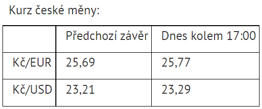 Zatímco v předchozích dnech ztrácela kvůli ruské invazi na Ukrajinu desítky haléřů, dnes k oběma hlavním světovým měnám klesla o osm haléřů. V 17:00 se podle serveru Patria Online obchodovala za 25,77 Kč/EUR. V průběhu dne ale byla i nad 25,80 Kč/EUR, což se stalo naposledy loni v červenci. Vůči dolaru dnes česká měna zavřela na 23,29 Kč/USD, to je nejslabší úroveň od loňského listopadu.