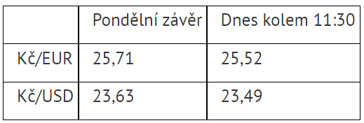 Nejvíce, přes pět procent, si připisovala Erste Bank, přes tři procenta zdražily akcie Komerční banky a pojišťovny VIG. Koruna posiluje k euru i dolaru, proti pondělnímu závěru si dopoledne k euru polepšila o 19 haléřů na 25,52 Kč/EUR a k dolaru o 14 haléřů na 23,49 Kč/USD. Vyplývá to z údajů serveru Patria Online.