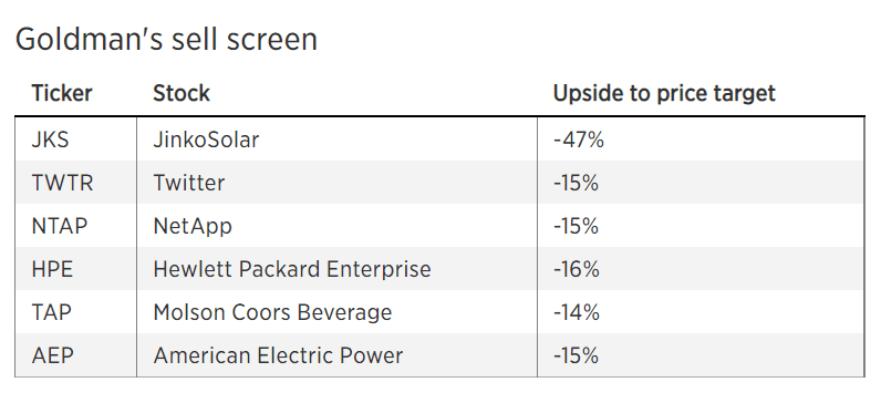 Firma na Wall Street si mezi svými analytiky vybírala jména s prodejním hodnocením, jejichž cílová cena se podle Goldmanu snížila nejméně o 10 %. Goldman má u uvedených akcií také odhady zisků na roky 2022 a 2023 pod konsensem, což znamená, že nedosažení zisků povede k poklesu.