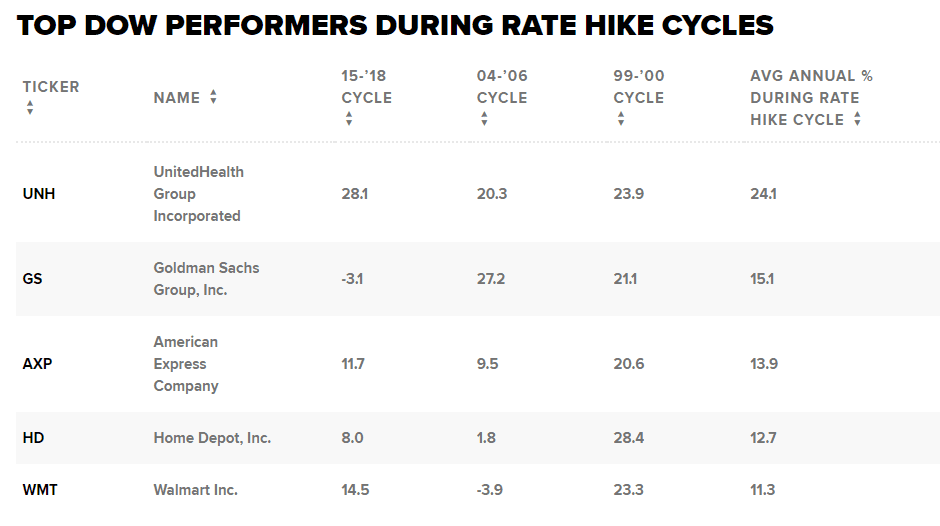 Vzhledem k tomu, že se Federální rezervní systém připravuje na soustavné zvyšování sazeb v příštích dvou letech, mohly by tyto akcie společnosti Dow na základě své výkonnosti během minulých cyklů zvyšování sazeb výrazně vyhrát.
