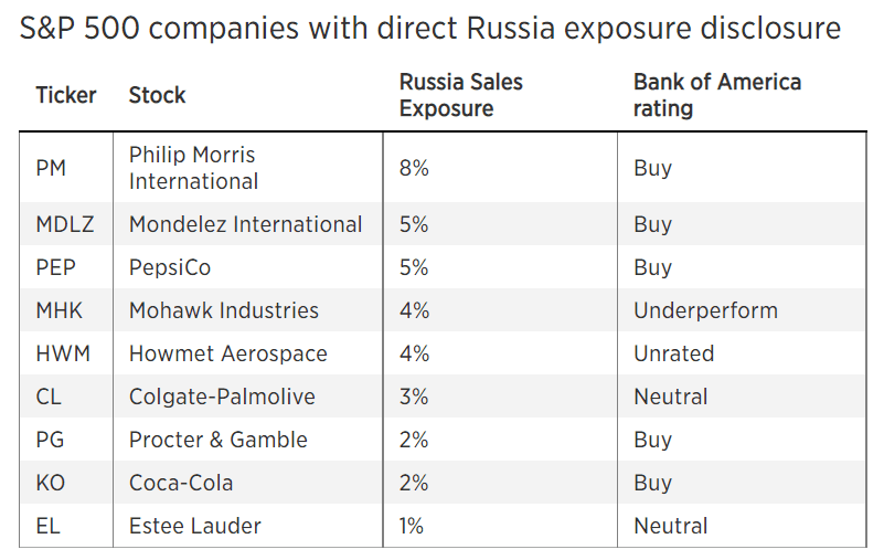 Přesto podle firmy z Wall Street existují některá jednotlivá jména, jejichž část tržeb pochází z Ruska.