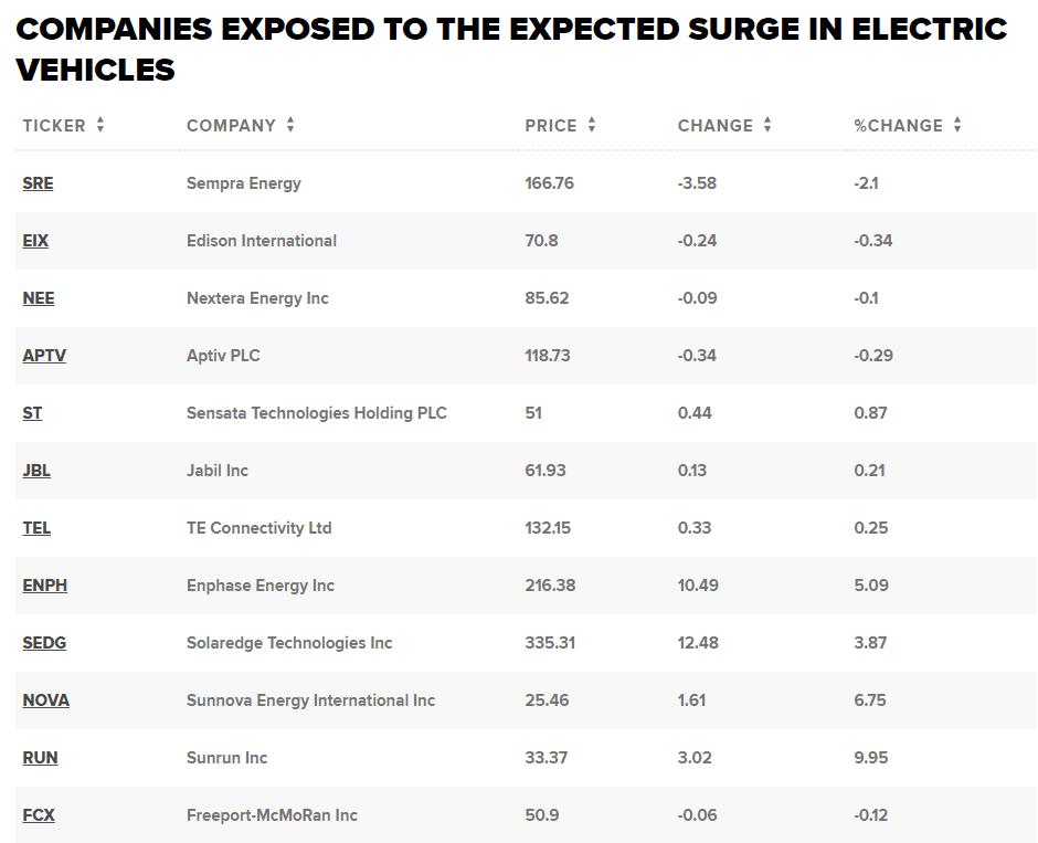 Společnosti, které vyrábějí nabíjecí komponenty, jako jsou Enphase Energy a SolarEdge, jsou podle Goldmana rovněž připraveny těžit. Solární firmy jako Sunnova a Sunrun by se mohly těšit z toho, že spotřebitelé spojí svůj elektromobil s domácím solárním systémem, aby kompenzovali náklady na zvýšenou zátěž elektřinou z elektromobilu.