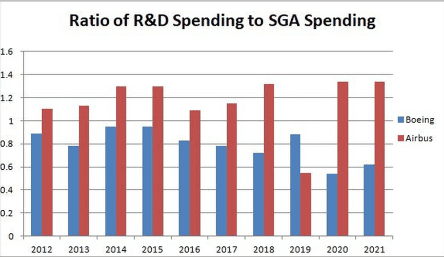 V tomto případě byl rok 2019 pro společnost Airbus rokem odchylek, kdy byly výdaje na výzkum a vývoj zkráceny. Ale každý jiný rok za posledních 10 let kladl Airbus na výzkum a vývoj mnohem větší důraz než Boeing. Během pandemie se tento rozdíl projevil obzvlášť výrazně, kdy Airbus vydal na výzkum a vývoj zhruba 1,34 USD na každý 1 USD vynaložený na SGA – zatímco Boeing vydal na výzkum a vývoj blíže 0,59 USD na každý 1 USD SGA!