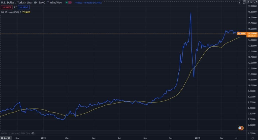 Vzhledem k tomu, že turecké zemědělství dováží řadu položek od osiv po hnojiva v dolarech, projevilo se znehodnocení liry ve vysokých cenách potravin pro domácnosti. Údaje o tureckém indexu spotřebitelských cen potravin a nealkoholických nápojů za březen vykázaly meziroční nárůst o 70,3 %. Turecko má úrodnou půdu pro zemědělství. Země je však závislá na dovozu zemědělských produktů.