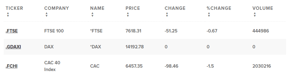 Britský FTSE 100 by měl podle IG klesnout o 53 bodů na 7561 bodů, francouzský CAC zřejmě poklesne o 70 bodů na 6474 bodů a německý DAX by měl ztratit 180 bodů na 13 994 bodů.