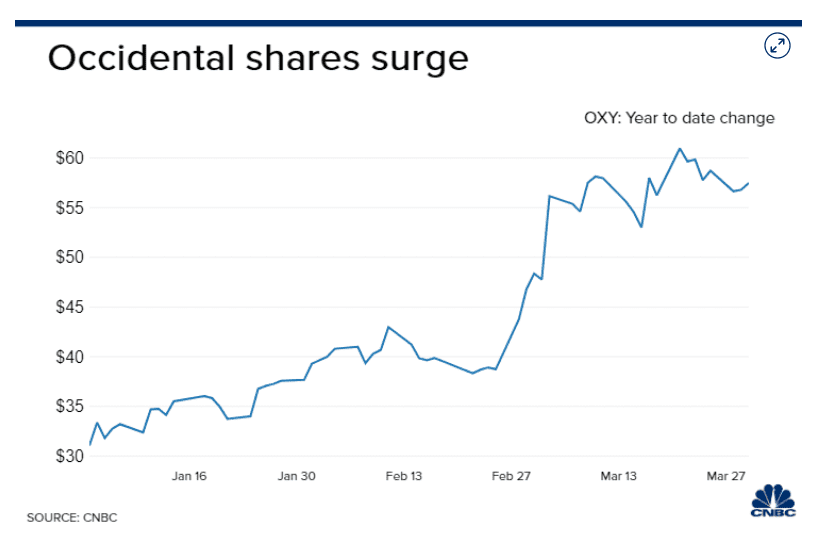 Buffett začátkem tohoto měsíce řekl Becky Quickové z CNBC, že se rozhodl začít nakupovat poté, co si přečetl přepis konferenčního hovoru společnosti Occidental k výsledkům hospodaření z 25. února.