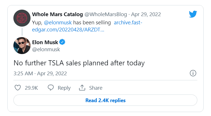 V okamžiku, kdy se podání dostala na veřejnost, Musk na Twitteru napsal: „Po dnešku se neplánují žádné další prodeje TSLA“. Poznámku učinil v reakci na účet, který na sociální síti silně propaguje akcie Tesly, produkty a Muska.