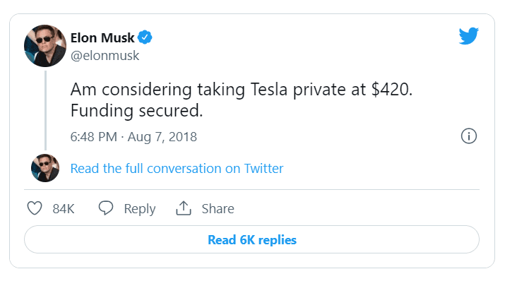 Vzpomeňte si na „zajištěné financování“. Tak zněl Muskův tweet ze srpna 2018, který naznačoval, že je připraven převzít Teslu do soukromých rukou za cenu 420 dolarů za akcii (kdyby to pomohlo vysvětlit nabídku 54,20 dolaru za Twitter). Je to také tweet, který vedl k žalobě ze strany Komise pro cenné papíry a burzy (SEC) a následnému urovnání sporu, podle něhož musí „Twitter sitter“ předem schválit všechny Muskovy tweety obsahující informace o společnosti, které by mohly ovlivnit cenu jejích akcií.