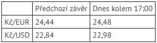 Vůči euru si ve srovnání s pondělním podvečerem pohoršila o čtyři haléře na 24,48 Kč/EUR. K dolaru za stejnou dobu oslabila o 14 haléřů na 22,98 Kč/USD. Vyplývá to z údajů serveru Patria Online.