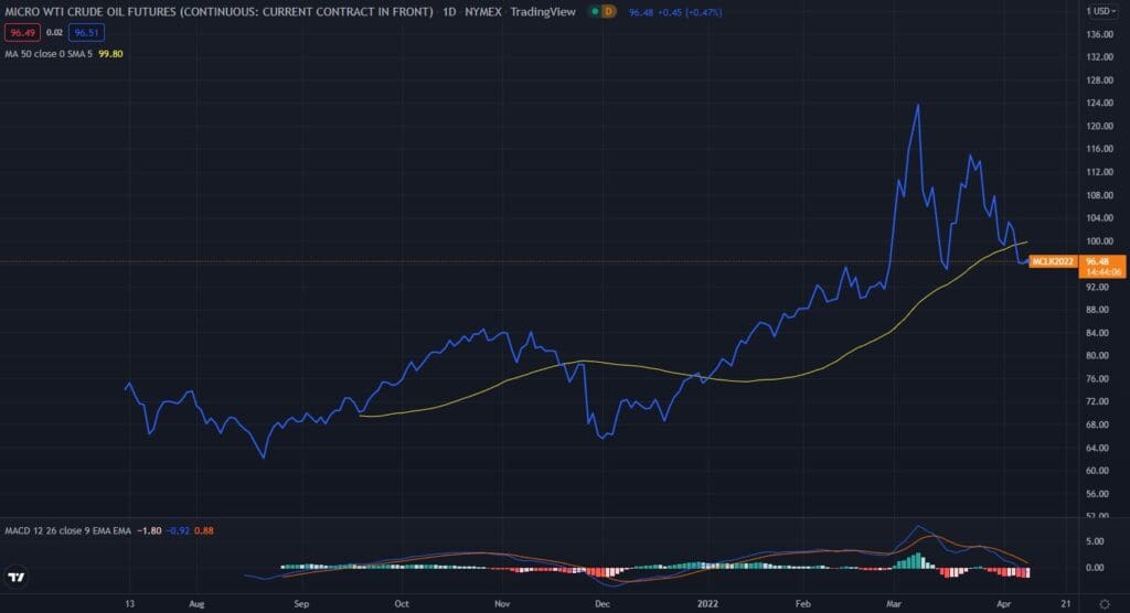 West Texas Intermediate se obchodoval nad 96 dolary za barel, přičemž ceny byly tento týden asi o 3 % nižší. Nedávný pokles znamená, že americký benchmark nyní ztratil většinu zisků zaznamenaných od začátku ruské invaze na Ukrajinu na konci února.