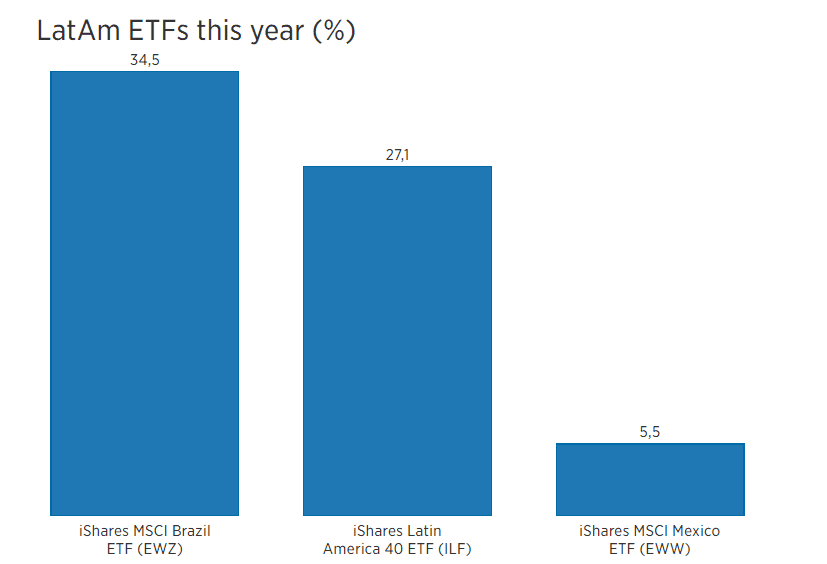 Investorům, kteří hledají širokou expozici vůči latinskoamerickým trhům, doporučila Bank of America ETF iShares Latin America 40 (ILF). Tento fond s nákladovým poměrem 0,48 % je v letošním roce na vzestupu – vzrostl o více než 27 %.
