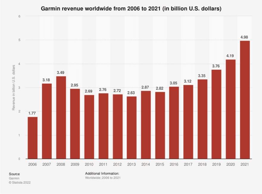 Během pandemie vzrostla popularita outdoorové rekreace, což společnosti pomohlo zvýšit tržby za rok 2021 o 19 %. Společnost však netěží pouze z nárůstu způsobeného pandemií. Za posledních pět let rostly tržby společnosti Garmin složenou roční mírou 10,5 %.