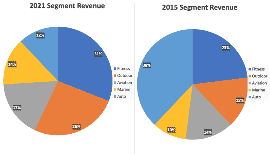 Společnost, kdysi známá svými GPS jednotkami pro automobily, změnila své podnikání tak, aby se do popředí dostaly segmenty fitness, outdoor, letectví a námořní doprava. Ve fiskálním roce 2009 tvořil automobilový segment 70 % celkových tržeb a ještě ve fiskálním roce 2015 tvořil 38 % obchodu. V loňském roce však fitness a outdoorové produkty tvořily dohromady 57 % tržeb, zatímco automobilový průmysl se zmenšil na 12 %.