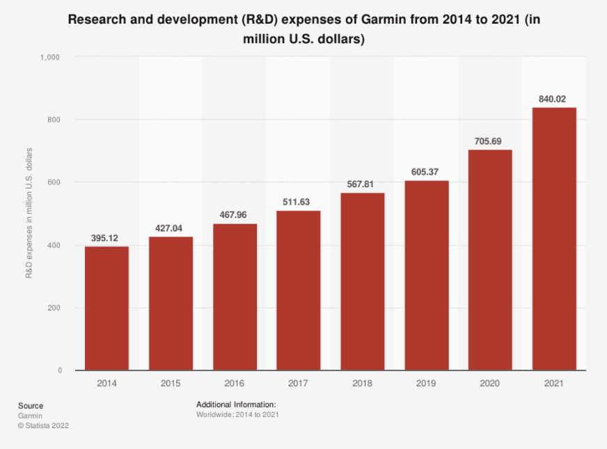 Společnost Garmin generuje ze svého podnikání obrovské množství hotovosti. To vysvětluje její silnou hotovostní pozici, ale společnost ji také reinvestuje, aby zajistila, že její produkty zůstanou oblíbené u outdoorových nadšenců. Její výdaje na výzkum a vývoj (R&D) rostou dokonce rychleji než její příjmy.