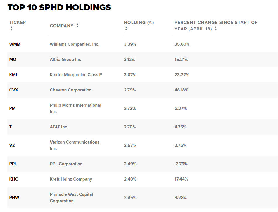Největší podíl ve fondu SPHD drží společnost Williams Companies, následovaná Altria Group a Kinder Morgan, které dohromady tvoří asi 9,6 % fondu, jak vyplývá z údajů společnosti Factset.