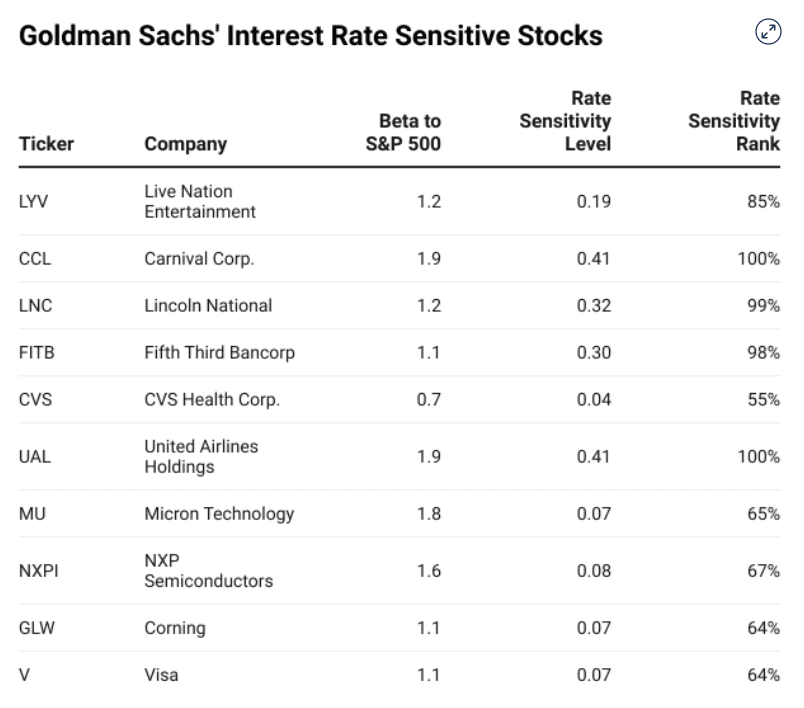 Investiční banka změřila betaverzi jednotlivých akcií na změny výnosů desetiletých amerických státních dluhopisů za poslední dva roky poté, co porovnala jejich citlivost s širším indexem S&P 500. V tabulce je úroveň citlivosti na sazby beta akcie a pořadí citlivosti na sazby je ve vztahu k indexu S&P 500, uvádí se v poznámce.