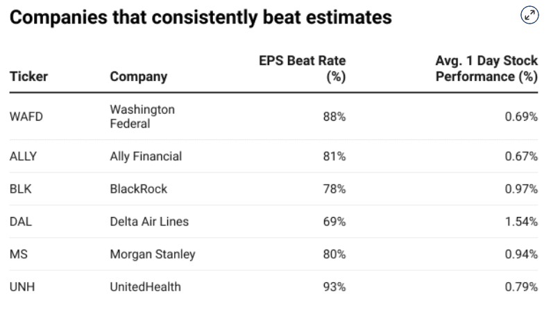 Vzhledem k těmto okolnostem prověřila společnost CNBC Pro údaje společnosti Bespoke Investment Group, aby zjistila, které společnosti v minulosti překonaly očekávání ohledně zisku a na základě těchto výsledků se obchodují výše.