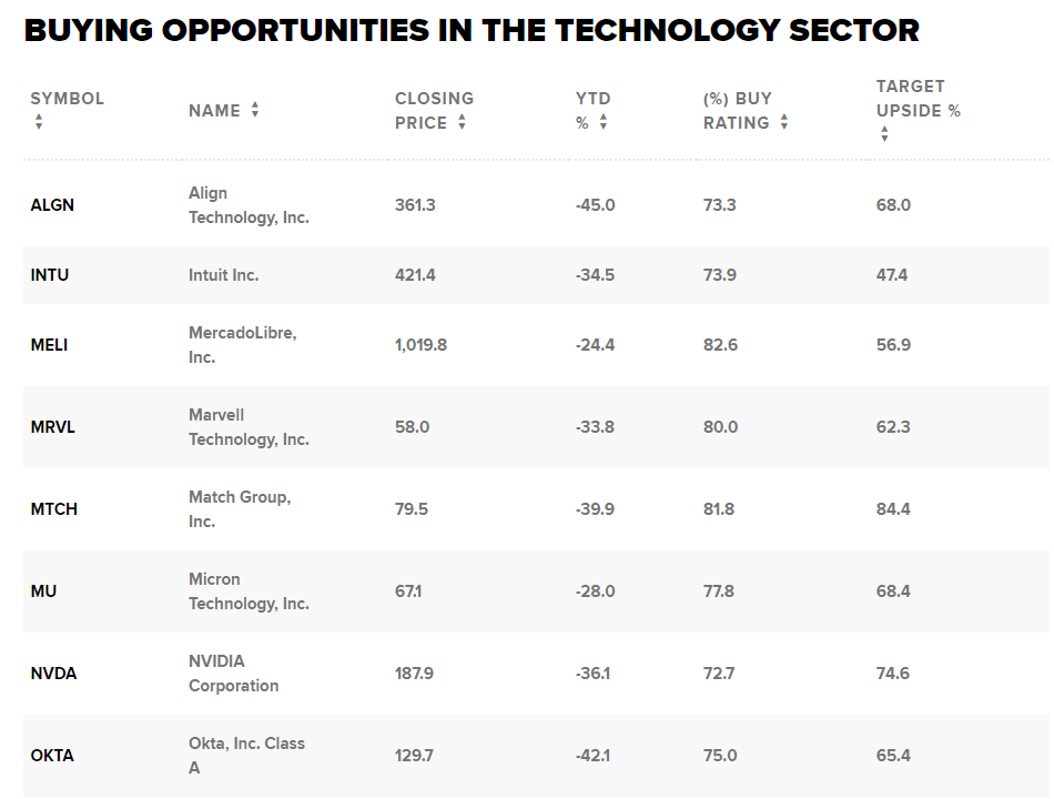 Vzhledem k tomu, že Nasdaq se propadá hlouběji do teritoria medvědího trhu, vyhledal server CNBC Pro otlučené technologické akcie, které nabízejí silný potenciál výnosů pro investory hledající v tomto sektoru světlá místa.Nejlepší tipy jsme našli tak, že jsme vyhledali akcie, které si oblíbili analytici, 70 % z nich říká, aby je koupili, a jejich akcie by se podle jejich konsensuálních cílových cen mohly odrazit o více než 20 %.Zde jsou některá technologická jména, která se dostala na seznam:Odvětví čipů je jedním z nejhůře postižených technologických odvětví, protože se potýká se zpomalující se spotřebitelskou poptávkou v souvislosti s rostoucí inflací a problémy v dodavatelském řetězci, a do seznamu se dostaly tři společnosti. Na pozadí výprodeje se společnosti Nvidia, Marvell Technology a Micron Technology letos propadly o 36,1 %, 33,8 % a 28 %.Mezitím se fond iShares Semiconductor ETF, který sleduje akcie čipů, propadl o více než 26 % a banka Goldman Sachs sází proti tomuto odvětví a nedávno snížila odhady zisku na akcii v sektoru čipů a snížila rating několika akcií v souvislosti s „náročnou“ ekonomikou.Tento pokles by však mohl pro investory znamenat příležitost k nákupu, protože každá z akcií nabízí více než 62% nárůst oproti cílovým hodnotám analytiků na základě konsensuálních odhadů, přičemž Nvidia nabízí potenciální výnos 74,6 % na základě konsensuální cílové ceny akcií.Chcete využít této příležitosti?Zdroj: Getty ImagesAkcie společnosti Align Technology se od začátku roku propadly o 45 %, což představuje největší pokles mezi akciemi, které se dostaly do seznamu. Pro výrobce Invisalign by však mohly přijít světlejší okamžiky a přinést potenciální 68% výnos na základě konsenzuálního cílového kurzu. Společnost zabývající se ortodoncií bude ve středu po zvonění rovněž reportovat své hospodářské výsledky a podle posledních údajů společnosti Bespoke překonává odhady v 82 % případů, načež její akcie v průměru rostou o 3,73 %.Stejně jako ostatním technologickým akciím není výprodej cizí ani příjemci pandemie, společnosti Match Group. Akcie od začátku roku klesly o téměř 40 %, ale na základě konsensuálních cílů by mohly posílit o 84,4 %. Laura Champine ze společnosti Loop Capital nedávno zahájila pokrytí akcií této online seznamky s nákupním ratingem a ve zprávě klientům uvedla, že vidí silný růst společnosti Match Group a její silná základna předplatitelů by mohla přinést úspěch v metaversu.