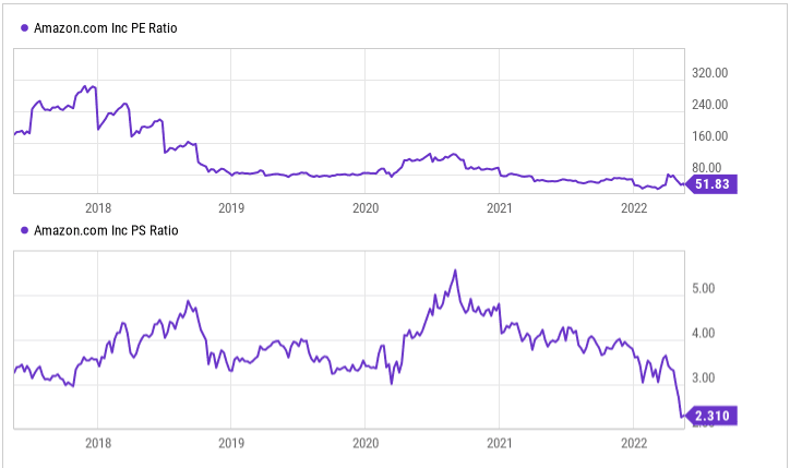 Důvody pro koupi Amazonu jsou ještě přesvědčivější, protože akcie jsou levnější než v posledních letech. Poměr ceny k tržbám Amazonu ve výši 2,3 a násobek ceny k zisku ve výši 52 se blíží minimu za posledních pět let. Společnost se ocitla ve vleku širokého výprodeje na trhu a její akcie jsou výrazně níže než na svých maximech.