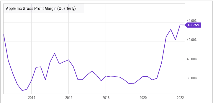 Další výhodou vzkvétajícího segmentu služeb je, že tyto jednotky často vytvářejí vyšší marže. Segment služeb společnosti Apple se může pochlubit hrubou marží 72,6 %, což je výrazně více než hrubá marže z produktového segmentu, která činí 36,4 %. Jak je vidět z níže uvedeného grafu, vyšší hrubá marže v oblasti služeb zvýšila celkovou hrubou marži společnosti Apple.