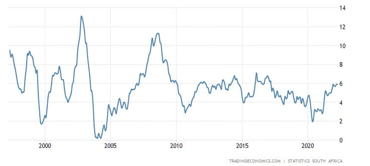Jihoafrická centrální banka ve čtvrtek, kdy přišla s největším zvýšením úrokových sazeb za více než šest let, revidovala prognózu růstu cen potravin na domácím trhu pro letošní rok z 6,1 % na 6,6 %. Její odhady ukazují, že cenové tlaky jsou stále silnější, přičemž inflace nyní dosáhne ve druhém čtvrtletí letošního roku vrcholu 6,3 % a na úroveň 4,5 % – střed cílového rozpětí, na kterém preferuje ukotvení očekávání – se vrátí až v posledním čtvrtletí roku 2024.