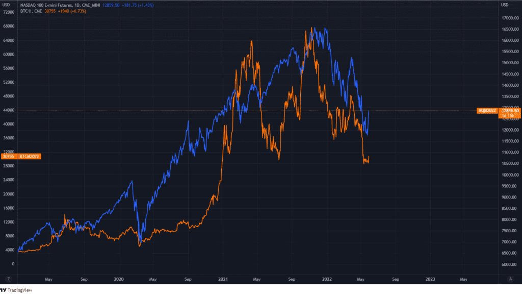 Bitcoin byl v posledních měsících brzděn tím, že Federální rezervní systém a další centrální banky se v prostředí tvrdošíjně vysoké inflace přiklonily k cyklům zvyšování úrokových sazeb. Sentiment v oblasti digitálních aktiv poškodil také kolaps ekosystému Terra. Obavy mezi pozorovateli trhu vzrostly o víkendu, kdy rekordně vysoká korelace s indexem Nasdaq 100 – ilustrující jeho chování jako rizikového aktiva – ustoupila do pozadí, protože akcie technologických společností rostly.