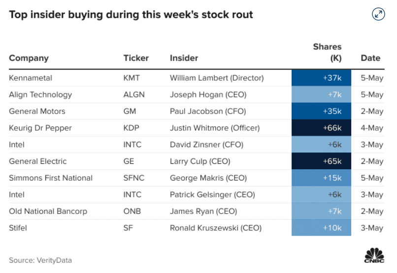 Podle společnosti VerityData řada vedoucích pracovníků společností od General Motors po Intel v průběhu rychlého a zběsilého výprodeje na Wall Street v posledních dnech nakupovala akcie svých společností. Trh zažil týden jako na horské dráze, když Federální rezervní systém provedl zvýšení úrokových sazeb o půl procentního bodu a zároveň signalizoval, že podobná agresivní zpřísňující opatření jsou na obzoru.