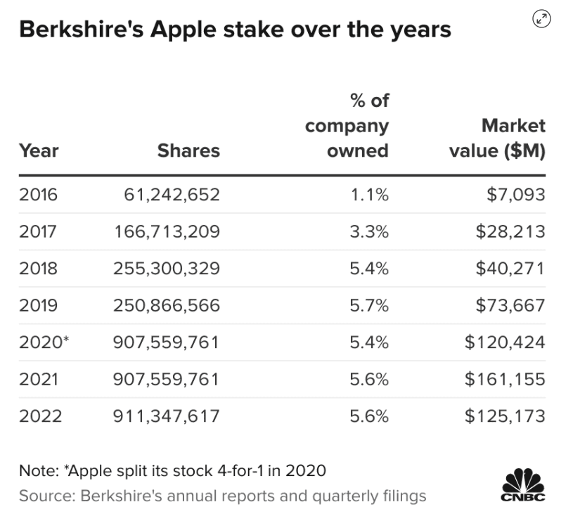 Berkshire začala nakupovat akcie Apple v roce 2016 pod vlivem Buffettových investičních zástupců Todda Combse a Teda Weschlera. Konglomerát tuto sázku v posledních několika letech navýšil na více než 100 miliard dolarů a zabírá zhruba 40 % akciového portfolia Berkshire.