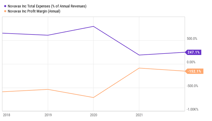 Vezměme si níže uvedený graf, který sleduje celkové náklady společnosti Novavax jako procento příjmů a její ziskové rozpětí.