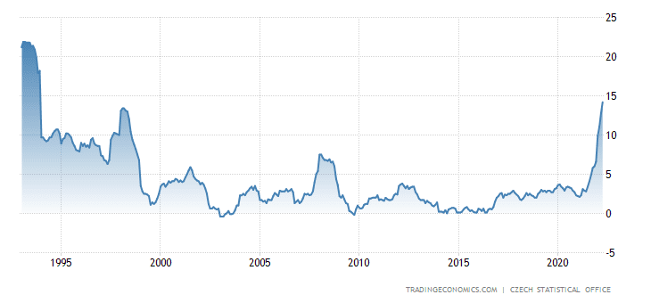 Inflace v dubnu zrychlila na 14,2 procenta z březnových 12,7 procenta. Vliv na to měly zejména ceny bydlení, pohonných hmot a potravin. Vyplývá to z údajů, které dnes zveřejnil Český statistický úřad . Analytici čekali pomalejší růst mírně nad 13 procenty. Meziměsíční růst spotřebitelských cen o 1,8 procenta byl dán zejména dražším bydlením a potravinami.„Spotřebitelské ceny vzrostly oproti loňskému dubnu o 14,2 procenta. Bylo to nejvíce za poslední tři desetiletí, kdy v prosinci 1993 meziroční růst cen dosáhl hodnoty 18,2 procenta,“ uvedla vedoucí oddělení statistiky spotřebitelských cen ČSÚ Pavla Šedivá. Ceny zboží úhrnem vzrostly o 15,3 procenta a ceny služeb o 12,1 procenta.V cenách vynakládaných za bydlení meziročně zdražila elektřina o 30,1 procenta, zemní plyn o 44,2 procenta, tuhá paliva o 24,1 procenta a teplo a teplá voda o 17,5 procenta. Růst byl ve všech případech vyšší než v březnu. Nájemné se v dubnu zvýšilo o 4,5 procenta, vodné o 5,3 procenta a stočné o 6,4 procenta.Inflace v ČR – Zdroj: TradingeconomicsRychlejší než v březnu byl dubnový meziroční růst také u potravin. Například mouka v dubnu meziročně zdražila o víc než polovinu, maso o 11 procent, polotučné trvanlivé mléko téměř o třetinu, vejce o víc než 14 procent a cukr o víc než čtvrtinu. Chleba byl tak proti loňsku dražší o víc než 20 procent, cena másla stoupla o 31,6 procenta a brambor o 19,2 procenta.Ceny lihovin naopak proti loňskému dubnu klesly o 4,1 procenta, u vína se nezměnily a u piva vzrostly o dvě procenta. Růst cen stravovacích služeb zrychlil na 19,5 procenta. Auta zdražila meziročně o téměř 14 procent a pohonné hmoty a oleje o 41,5 procenta. „Ceny oděvů vzrostly o 21,4 procenta a obuvi o 15,2 procenta,“ uvedl ČSÚ.